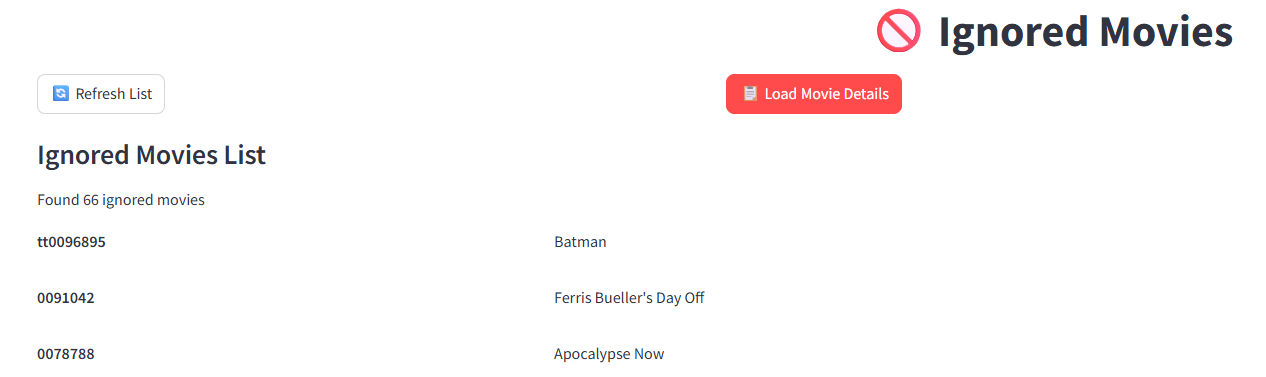 I have also added an “Ignore” list for movies that I have no interest in watching or (more likely) movies that I watched before I started creating reviews. These movies are not added to the recommendations.