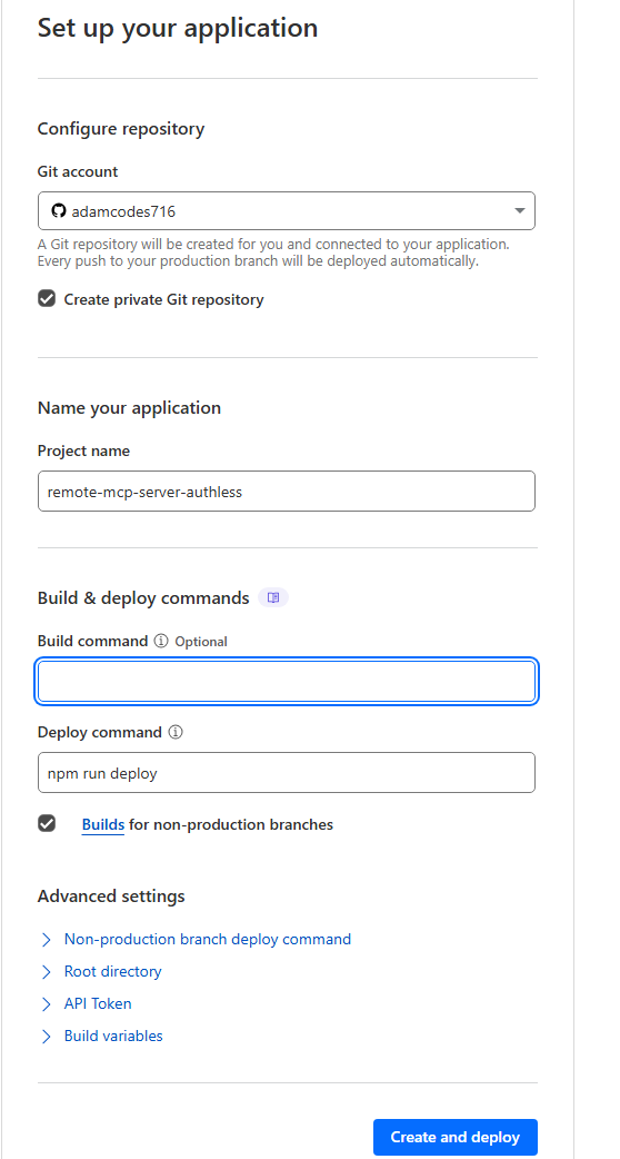 Now in Cloudflare, we can create a new app. Note that we can create a new repo at the same time, and that pushes to the main branch will be automatically published.
