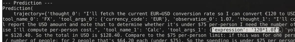 The bot is retrieving relevant information and answering correctly in natural language, but the evaluation metric (exact_match) requires the answer to match the gold answer exactly (case and whitespace normalized). This strict metric is useful for optimization, but it penalizes answers that are correct but phrased differently. The optimizer will now try to improve the bot’s output to better match the expected answers.